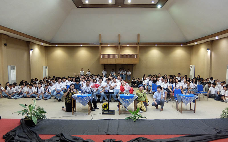 ハラパン高校では、国際担当のユニタ教諭と五十嵐さん、生徒たちが司会や通訳、会場準備を進めます。そして約300人が講堂に集まり、「えびすかき」に大きな拍手が送られました。さらに、バリ在住で、バトゥール湖周辺に環境保護活動として植樹を進めている光森氏や国立キンタマーニ高校の副校長オカ氏らの協力で、国立キンタマーニ高校2年生が鑑賞。生徒たちは「〽ツ〜ローヨ ツ〜ローヨ(釣ろうよ)」と一緒に唄を歌うなど大盛り上がりでした。